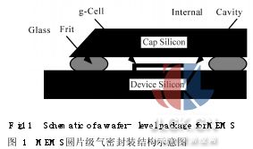 1引言 MEMS器件通常包含一些可动部分,这些可动部件很脆弱,极易受到划片和装配过程中的灰尘、气流、水汽、机械等因素的影响,从而造成器件毁坏或整体性能下降。此外,密封腔内气体的可控性(包括真空)也是影响器件运行的一个很重要的因素[1],例如依靠谐振原理工作的MEMS器件(包括高精度加速度计、陀螺和RF谐振器等)需要气密性封装以维持稳定的谐振频率和气体阻尼系数[2]。气密性封装还可以降低水气含量,防止MEMS器件的粘性失效。因此,高可靠的气密性以及腔体气体的可控性是保证器件运行稳定和低漂移的关键所在。目前,静电键合是国内外普遍使用的一种气密封装工艺,它具有键合强度高、重复性好、气密性高等优点,但是该方法对键合面的清洁度和平整度要求很高,如键合前芯片的光学加工,要求光洁度达V14级以上,表面不平整度应<50nm[3]。因此,生产效率较低,容易产生开裂、自动脱落等[4],总体成本较高。相比之下,玻璃浆料低温键合对于芯片及基板表面无特殊要求,具有工艺简单、性能优良、键合强度高、密封效果好等优点,并且可实现圆片级的封装,大大降低了封装成本。因此,在满足稳定性和可靠性的条件下,采用低温玻璃键合具有可观的经济效益。目前国内对玻璃浆料的制备及单个元件的气密封装有一定研究[5-7],但关于圆片级封装及具体工艺过程未见报道。本工作系统地研究了玻璃浆料在低温下气密封装MEMS器件的过程,并就气密封装过程中参数的优化及封装后的气密性等进行了研究。 2密封结构的制备 2·1玻璃浆料的选择 选择玻璃浆料时应满足以下几点要求: (1)热膨胀系数与基板材料匹配; (2)封接温度应低于基板材料的耐热极限温度; (3)浆料与基板及芯片有良好的浸润性。实验中采用硅或者玻璃为基板材料。考虑到Al布线,选择的玻璃焊料的封接温度应低于550℃(Al-Si共熔点577℃)。 选用Ferro公司提供的玻璃浆料,这是一种非晶态厚膜玻璃,封接温度约为450℃,热膨胀系数90×10-7/℃(与Si 26×10-7/℃以及Pyrex7740玻璃33×10-7/℃接近),并且该玻璃浆料与Si及玻璃基板均有良好的浸润性。利用扫描电镜上的X-射线能谱仪对玻璃浆料进行得出各组分的百分比MgO:6·59w%t ;Al2O3: 29·76w%t ; SiO2: 43·67w%t ; PbO2:19·09w%t ;ZnO: 0·88w%t。 2·2密封结构的实现 玻璃浆料通过丝网印刷在硅盖板上形成5·5mm×5·5mm的闭合方形环,环宽0·5mm,印刷厚度50μm。然后将此硅盖板放入回流炉中进行预烧结,使玻璃浆料中的有机溶剂完全挥发,并且在硅盖板上固化成型。预烧结完成后的硅盖板与传感器芯片对准放置,使器件位于玻璃浆料形成的闭合环中,放入键合机中进行烧结,形成密封腔。密封腔单元结构如图1所示。