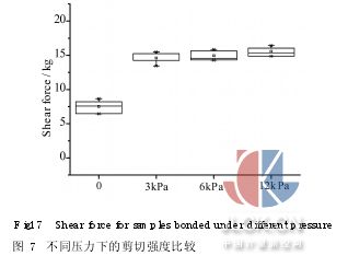 由图中可以看出,烧结温度越高,键合后的剪切力越大。烧结温度为400℃和450℃时,剪切力较低,仅为10kg,这是因为峰值温度太低,没有达到玻璃浆料的熔融温度,浆料中的颗粒未完全熔融,不均匀的分布在键合层,导致键合强度的降低。扫描电镜下观察到的图像如图4所示,玻璃浆料分布不连续,均匀性较差,这是影响键合强度的主要因素。图5为500℃烧结后键合层形貌的扫描电镜图。与400℃的图像相比较,玻璃浆料中的颗粒充分熔融,仅有较小的颗粒和气孔。经测量,在烧结温度为500℃时,剪切力平均值为15·2kg,与400℃和450℃的烧结温度下的剪切力相比有了较大提高。由此说明, 500℃以上的烧结温度可达到较高的键合强度。然而,基于器件上金属布线的限制,烧结温度不能高于550℃(Al-Si共熔点577℃)。 3·3键合气氛对键合强度的影响 图6为不同键合气氛下的剪切力测量值(预烧结温度400℃,烧结温度500℃)。从图中可以看出,在空气、氮气和真空中的剪切力大小基本一致,因此可以认为,键合气氛对键合强度的影响可以忽略不计。 3·4压力对键合强度的影响 在烧结过程中需加以一定压力,以保证键合强度及气密性要求。图7为不同压力下的剪切力测量值(预烧结温度400℃,烧结温度500℃,氮气气氛)。当外加压力为0时,剪切力为8kg。当外加压强为3kPa时,剪切力提高到了15kg,而再继续增加到6kPa、12kPa时,剪切强度值没有明显变化。这是因为预烧结后浆料表面凹凸不平,即使浆料中的颗粒完全熔融,在没有施加外压的情况下,表面张力的存在使得键合面未能完全接触,键合层中含有气泡和孔洞,影响了键合强度。所需的外压只需克服浆料熔融时的表面张力,使键合面完全接触,排出不平整处残留的气体。因此,施加外压后键合强度显著提高。