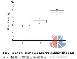 国内已有对玻璃浆料气密封装的研究[8],但是对基于圆片级的封装技术未见有报道。实验中为了便于观察圆片级封装的各环状单元玻璃浆料烧结后的形貌特征,用玻璃圆片代替硅盖板进行键合。实验结果如图2所示。 封装质量通过检测各单元的剪切强度及气密性来评定。剪切试验在Dage Series 4000键合强度测试机上进行,对样品的统计数据进行比较。气密性检测通过氦气精检和氟油粗检两步进行。氦气精检使用Varian 947氦检漏仪,其检漏精度为0·2×10-9atm cc/sec。氟油粗检在KYKY F-3型氟油加压检漏仪中进行。样品放入轻氟油(沸点45℃)中,在常温下保压4h后取出放入125℃的重氟油(沸点165℃)中观察是否有连续气泡产生。 3实验结果及讨论 3·1预烧结工艺对键合质量的影响 预烧结选择在空气中进行,其主要目的是使璃浆料中的有机溶剂充分挥发。预烧结温度的选择直接影响到键合质量的好坏。分别采用120℃和400℃两个典型的预烧结温度,实验发现,预烧结峰值温度为120℃时,由于峰值温度未达到有机溶剂的沸点,玻璃浆料中的有机溶剂未完全挥发,烧结后的封环中有大量的气泡存在,影响了气密封装的质量,降低了其可靠性。 3·2烧结温度对键合强度的影响 预烧结工艺后进行烧结(预烧结选择在空气中进行,峰值温度为400℃)。图3为相同预烧结条件不同烧结条件下样品的剪切力测量值(a的峰值温度为400℃, b的峰值温度为450℃, c的峰值温度为500℃)。图中方框的中心代表样品剪切力的平均值,方框的厚度表示结果的标准均方差,而竖线的顶端和底部相对应的十字叉形分别表示剪切力的最大值和最小值。