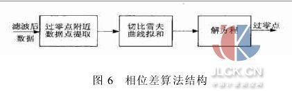 改进FIR带通滤波器提高了信号的信噪比,并且两路信号相移相同,因此,有效地保证了上述相位差检测算法的精度。为了满足系统的实时性,系统必须在两次采样时间间隔内,完成两路数据的滤波、曲线拟和以及过零点、相位差和频率的计算。过零点检测算法的结构如图6所示。通过软件实时检测滤波后数据,当出现x(n)>0,x(n+1)<0或者x(n)<0,x(n+1)>0,即认为过零点在x(n)和x(n+1)之间,因此将x(n)前后各5个点存储到指定的存储单元,为切比雪夫曲线拟和提供原始数据。通过仿真计算,采用2次曲线拟和就可以达到很高的计算精度。拟和后的2次曲线,通过传统的解方程的形式来计算信号的过零点,在实际应用中舍弃解方程中在x(n)和x(n+1)之外的那个根。这样就可以根据两路信号的过零点来计算信号的相位差。由于系统的采样时间间隔为52.08μs (1/19200Hz),DSP(以TMS320VC33为例)的运算速度为每个指令周期17ns,完成一次采样、滤波和相位差算法所需要指令周期为17ns×2000=34μs,所以在采样的时间间隔内DSP完全可以完成计算,保证了系统的实时性。