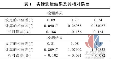 3实验结果 为了验证算法的精度,首先,在实验室环境下,利用NI-DAQ 6110E两路16位DA产生两路正弦信号,信号的幅值、频率和两路信号的相位均由计算机设定,而且信号上可以根据要求任意叠加进各种干扰信息,完全可以模拟现场信号情况。表1是根据前面对现场数据的分析,由NI-DAQ生成的两路正弦信号,经过上述算法检测的相位差结果。信号频率f=80Hz,幅值5V,干扰信号包括频率f=160Hz,幅值0.5V正弦信号,频率f=240Hz,幅值0.1V正弦信号,频率f=50Hz,幅值0.2V正弦信号,以及幅值0.1V的白噪声信号。