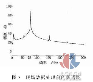 2相位差检测原理 数字式的过零点检测原理计算两路信号的相位差,如图2所示。B和B’点的拾振信号经AD同步采样后,得到一系列数据点,在过零点附近,对数据进行曲线拟和(图中曲线所示),求出拟和曲线与横轴交点,作为曲线的过零点,得到两路信号的过零点的时间差,由时间差即可算出信号的相位差。由前述相位差检测原理分析可知,当原始信号中叠加有噪声时,有可能改变信号过零点的位置,影响相位差的计算精度。 图3给出了某公司Φ50口径科氏质量流量计的一组现场测试数据的谱分析结果。 显然,信号中除了传感器工作频率f0=77.32Hz外,还存在着2f0、3f0和50Hz工频信号。根据文献[6]的分析,2f0和3f0信号是由于传感器本身的非线性造成的,这与传感器的结构参数和工作状态有关。实验分析表明,这些干扰信号对相位差计算的精度有较大影响。因此在相位差计算之前,必须对信号进行滤波,提高信噪比。由于前述模拟滤波器的缺点,作者采用在DSP中进行数字带通滤波的方案。为了更好地再现原始信号,提高系统相位差检测的精度,采用了远高于信号频率的采样率fSample=19.2kHz。 这里所针对的实际传感器基本特性为: 工作频率范围:65~110Hz 相位差范围:0.09~1.8° 因此选定数字滤波器通带略大于传感器工作频率范围55~120Hz;由于某些干扰信号的频率很接近传感器工作频率,为有效抑制这些干扰信号,滤波器过渡带必须足够陡峭,为实现此通带特性,通过分析仿真,初步选定3000阶FIR滤波器实现带通滤波。