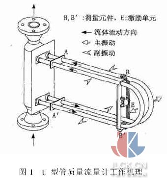 1引言 科里奥利质量流量计(以下简称为科氏质量流量计,即CMF)是一种利用被测流体在振动测量管内产生与质量流量成正比的科氏力为原理所制成的一种直接式质量流量仪表。CMF直接敏感被测流体的质量流量,同时可以检测流体的密度、体积流量,是一种应用广泛的新型多功能流量测量仪表。 图1中双U型管工作在谐振状态,流体在管中沿箭头方向流动。由于哥氏效应(Coriolis Effect)的作用,U型管产生关于中心对称轴的一阶扭转“副振动”。该一阶扭转“副振动”相当于U型管自身的二阶弯曲振动。同时,该“副振动”直接与所流过的“质量流量(kg/s)”成比例。因此,通过检测U型管的“合成振动”在B,B’两点的相位差就可以得到流体的质量流量[1~2]。