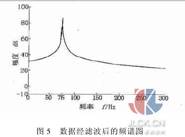 这种改进的FIR滤波器保留了传统FIR滤波器的线性相移的优点。同时在这种实时的信号处理系统中,在每一次采样时间间隔内,滤波计算只需要进行61次乘法运算和60次加法运算,而达到同样滤波效果的3000阶FIR滤波器则需要3001次乘法运算和3000次加法运算,显然,计算量大大降低。图5为利用上述带通算法,在DSP TMS320VC33上,将上述从现场采集回的原始数据进行滤波后,通过Mat lab分析的结果。 图5和图3比较可以看出,滤波的效果相当明显。此种算法很有效地抑制了信号的干扰,提高了信噪比,从而为后续相位差信号的提取提供了保障;由FIR滤波器的特点可知,它满足线性相移的特性。对于质量流量计而言,由于其流体密度的改变,传感器谐振频率会随之变化,因此在不同时刻的采样值代表不同频率的信息,数字滤波器的特性就是要利用其前面N个点的数据进行滤波,传统的非线性相移的滤波器将导致计算误差的存在,而只要质量流量计的两路信号通过同样系数的这种FIR滤波器,所造成的两路信号的相移为线性,因此有效克服了传统滤波器对两路信号相位差的影响。