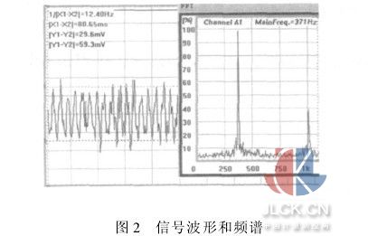 2.3实验数据验证 根据上述的原理选口径为50mm的涡街样机,传感器探头选用立片式结构,其信号大,可以将其等效为交流电压源。在以罗茨鼓风机为气源的空气流量标定装置上进行试验,用数字示波器测量原始涡街压电晶体信号的电压幅值Vm,并将信号进行频谱分析测出涡街频率f,如图2所示,同时记录气体的压力值P,实验时气温为21℃。