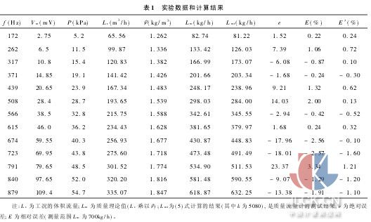 将记录的实验数据和计算结果,制成表1。工况气体的体积流量Lv和涡街频率f是线性关系,由涡街公式算出。进而将工况气体的密度和工况体积流量相乘,得到理论质量流量Lm。根据(7)式由涡街信号的幅值和涡街的频率计算出质量流量(其中λ为5080,由标定设备的标准表测得流量,经运算得到)Lmt,是由涡街信号幅值补偿得到的质量流量。将Lm和Lmt进行比较计算出绝对误差和相对误差。