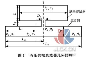 引言 脉动衰减器是液压系统中一种常用的压力脉动衰减装置,在减小液压系统的振动和噪声方面具有重要的作用。国内外众多学者对液压系统脉动衰减装置进行了研究:邢科礼[1]开发了一种新型囊式结构的压力脉动消减装置,小岛英一等[2]提出了一种变结构的共振式衰减器。近年来,国外已经应用泵体内置固定缓冲瓶的航空液压泵[3]。 同时,对于液压共振衰减器的分析基础———流体管道动态特性的计算方法也在不断发展。早期利用无损模型和线性摩擦模型进行计算分析;后来发展的耗散模型被认为是精确模型,但其中含有Bessel函数,不易直接应用。很多学者对管道模型中的Bessel函数进行近似处理,取得了较好的效果。但通过近似方法得到的模型适应性较差,仅适用于一些简单结构的衰减器的精确计算,对于复杂结构的衰减器就无能为力了。 本文在计算流体动力学(computational fluiddynamics,CFD)数值计算的基础上,建立了液压衰减器的频率分析模型,讨论了模型的有效性、准确性和适应性。以M序列压力信号模拟压力激励,考虑油液的可压缩性,利用CFD分析工具包OpenFOAM对衰减器进行瞬态计算,对时域计算结果进行FFT变换,得到衰减器的频率特性。分析了三种不同共振腔尺寸衰减器的频率特性,并将其与传统分析结果进行对比,验证了模型的有效性和准确性。同时,将该方法用于一种结构较为复杂的衰减器的频率特性计算。 1衰减器频率响应分析CFD模型 普通共振式衰减器的结构如图1所示,包含了液压系统的主管路和衰减器。假定条件如下:流体在系统中的状态为层流;流体为连续介质,且流动为牛顿流动;流体可压缩,同时忽略温度、气穴以及重力加速度的影响;流体速度远小于声音在流体中传递的速度;管道为刚体,忽略其弹性。图1中,p1、q1为1端压力和流量,p2、q2为2端压力和流量,p3、q3为衰减器颈部入口的压力和流量,p4、q4为衰减器共振腔底部的压力和流量,px、qx为主管路任意一处的压力和流量。