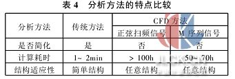 从计算分析方法的特点来看,传统分析与CFD分析方法在简化性、计算耗时性和结构适应性等方面均存在差异,不同分析方法的特点比较如表4所示:两种CFD方法均比传统方法计算耗时量大得多;CFD的优势在于无须简化,对于复杂结构的适应性更强;在两种CFD方法中,M序列激励由于一次可以获得一定范围的频率响应,因此比使用正弦扫频信号耗时少。