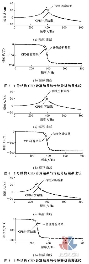 4.2计算结果分析 对表3中不同共振腔结构的衰减器进行模拟,其结果如图5~图7所示。由图5~图7可以看出,CFD计算结果与传统分析结果一致;CFD计算所得的共振频率稍小于传统分析的结果,并且共振频率处的幅值也小于传统分析结果,高频段的幅值也略小于传统分析结果。CFD计算的频率特性在高频段略小于传统分析的原因可能是传统分析在高频段对黏性估计不足造成的。 1号和2号结构具有相同容积的共振腔,传统分析CFD分析得到的频率响应相近,如图5、图6所示。1号和3号结构具有相同共振腔直径,但共振腔长度不同,3号结构的共振腔长度大,共振腔体积也大,其共振频率就低,如图5、图7所示。