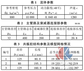 3计算参数 计算所用流体为46号抗磨液压油,其物理参数如表1所示。根据实际液压系统中管道的几何尺寸,主管路及连接部的结构参数如表2所示。网格的划分采用四面体网格,共振腔结构参数及模型节点总数和网格总数见表3。