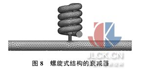 5应用 为验证文中所述分析方法的适应性,对图8所示的螺旋形衰减器结构进行分析,图中主管路和连接部的尺寸同表2,螺旋结构的管内径为20mm,总长度为875mm。如采用传统计算方法,这种结构基本上无法计算;采用CFD计算时无须简化,直接划分网格,设定边界条件、流体属性后即可进行计算。