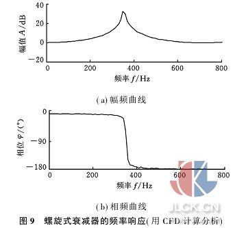 图9所示为通过CFD计算得出的图8所示螺旋结构衰减器的频率响应。计算结果表明:利用M序列作为激励信号,通过CFD模拟的方法可以胜任复杂结构衰减器的频率响应分析。