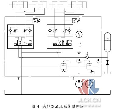 2·2·2应用容积调速回路和联合调速回路 利用改变变量泵或变量液压马达的排量来调节执行元件运动速度的回路,称为容积调速回路。这种调速回路无溢流损失和节流损失,故效率高、发热少,适用于高压大流量、大功率设备的液压系统。 联合调速回路无溢流损失,其效率比节流调速回路高。在采用联合调速方式中,应区别不同情况而选用不同方案:对于进给速度要求随负载的增加而减少的工况,宜采用限压式变量泵节流调速回路;对于在负载变化的情况下进给速度要求恒定的工况,宜采用稳流式变量泵节流调速回路;对于在负载变化的情况下,供油压力要求恒定的工况,宜采用恒压变量泵节流调速回路。 2·3蓄能器的合理应用 2·3·1应用蓄能器作辅助动力源 如图4为我公司为秦皇岛设计的夹轮器液压系统原理图。 工作开始时,恒压变量泵启动,当压力达到顺序阀的设定值,顺序阀打开给蓄能器充油,当充油压力达到泵的调定值时,泵处于恒压卸荷状态,蓄能器充油完成。 夹紧动作执行时,蓄能器通过单向阀2与泵一起向液压缸供油,满足液压缸快速夹紧的动作要求,夹紧到位,单向阀1封住保压,压力继电器发出联锁信号,可以执行本工作周期的下一步动作。 这种控制思路可应用于总的工作时间较短的间歇工作系统或在一个工作循环内速度差别很大的系统。使用蓄能器作辅助动力源可降低泵的功率,提高效率,降低温升,节省能源,故系统设计时,只需按平均流量选用泵,从而使泵的选用和功率利用更合理。