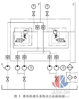 2·2合理选择动力源类型 2·2·1应用多级泵的供油回路 如图3,焦炉设备中推焦机液压系统动力源部分。 通过分析系统的各种实际功能要求,从节能的角度我们选用了两个双联泵(流量一大一小)。两个双联泵通过压力油出口处的溢流阀可以调定出相同或者不同的工作压力,选用不同的组合方式就可以得到三种不同的系统流量值。当使用大流量(小流量)的泵时,小流量(大流量)的泵就可以通过溢流阀低压卸荷。因此,合理选择动力源类型,能找到更多的节能途径。这种回路功率利用合理,效率较高。