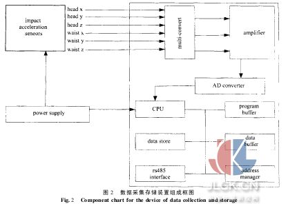 载人飞行中,航天员会遇到超重现象[1]。超重分持续性超重和冲击性超重,在飞船发射或返回过程中会发生持续性超重,作用时间至少持续几秒钟;在飞船返回着陆或逃逸塔救生时会发生冲击性超重,作用时间一般在1 s以内。当冲击性超重值超标,特别是飞船返回着陆时的冲击加速度值过大,可使航天员受伤或致命。因此飞船返回舱着陆冲击加速度对航天员的生命健康有着至关重要的影响,飞船返回舱着陆冲击因素的医学评价对于保证航天员身体健康和生命安全具有十分重要的意义[2,3],是无人飞船医学评价的重要内容。我国的载人航天工程在“神舟”2号无人试验后增加了测量飞船返回舱冲击加速度的试验项目,项目通过研制飞船返回舱着陆冲击加速度测量设备,参加“神舟”3号、“神舟”4号无人飞船飞行试验,获取了飞船返回舱着陆冲击加速度试验数据,回答了返回舱着陆冲击力学参数是否满足医学评价要求,首飞航天员上天后能否安全返回的重大问题。 研制过程中的关键技术 由于该项目立项时,“神舟”3号飞船设计已经完成,飞船系统无法提供本设备的供电、重量、指令触发等技术问题,因此这些问题也就成为产品研制过程中首先要解决的。 设备供电船载电子产品工作需要电源,而设备电源来源不外乎两种,由飞船电源系统供电或设备自带电池供电。由于本项目的特殊性,其功耗未在飞船电源系统的最初考虑范围内。而且飞船返回着陆时,飞船返回舱着陆目线存在断电动作,可能导致系统无法正常记录着陆冲击加速度值。因此必须研制专用电池组,为系统提供电源。电池组电源开关在飞船待发段由地面人员打开,在飞船返回地面后由地面人员关闭。 重量与设备供电问题一样,设备重量、体积也未在飞船系统考虑范围内,但任何设备不可避免地存在体积、重量。为不影响飞船重量,将我所承担的无人飞船形体假人进行改装、配重,将设备安装在假人胸腔,保证整体重量满足形体假人交付要求,设备传感器电缆从假人颈部引出。冲击加速度传感器的安装传感器安装位置对数据测量结果影响较大,为最真实准确地测量航天员着陆时冲击加速度值,安装在航天员乘坐的返回舱座椅背面,对应于航天员头部和腰部位置。该位置是人体着陆冲击过程中最易受伤的两测量点,每个测量点均包括x、y、z方向。 数据存储记录的阈值上天产品的存储空间非常宝贵,不可能一直对数据进行采集存储。为了保证长时间的数据采集存储,必须要降低数据采样率。而为了尽可能地包含更多的信息,又要求数据采样率尽可能高,根据采样定理,至少要大于信息中最高频率分量的2倍。系统设计考虑了综合因素,设定采样阈值,系统一直按照2 K采样率对各通道数据进行采样,小于阈值时只采样不存储,大于或等于阈值后,则边采样边存储。系统测量的准确性系统测量准确性问题在设计开始就予以高度重视,必须保证测量数据的准确可靠,影响测量准确性的因素包括:传感器精度、线性度,数据采样时的AD精度问题,地面数据处理软件的算法等等。选用的传感器在装配前必须经过校准、标定,装配后整套系统还由精度更高级的类似测试系统进行标定,地面数据处理软件的算法尽可能采用测试系统算法等等。 设备组成及工作模式 返回舱冲击加速度测量设备主要由冲击加速度传感器、数据采集存贮装置、自带专用电池组、地面数据回放处理设备和相应软件组成,详细系统组成框图如图1所示。
