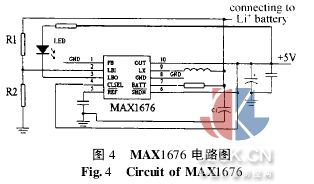 使用时,将Modem与监护仪相连,同时保证中心站端的Modem和心电接收程序处于开启状态,则按下监护仪上的Modem传输键,程序将自动拨号连接,开始传送心电数据。通过监护仪上的按键可以选择传送不同段的心电数据。 模拟通讯模块[5]监护仪的另一种通讯方式,是把数字心电信号经过D/A转换和电压/频率(V/F)转换变成频率电信号,然后通过特定发声装置将此频率信号转换为模拟音频信号,最后拨通普通电话将此音频信号传送给医院中心站,医院端的相应接收设备再将声音信号还原为心电信号。这种方式操作方便,不需要为监护仪附加特殊的通讯设备,适合短期心电数据的传送,是Mo-dem传送方式的有益补充。 D/A转换芯片采用串行控制的MAX5355,其转换精度为10位。转换后的模拟电压信号接入锁相环集成芯片CD4046进行V/F转换,成为脉冲频率信号。最后,我们用一个三极管驱动一个压电陶瓷蜂鸣片,将此频率信号转化为音频信号。压电陶瓷蜂鸣片是一种电-声能转换装置,当在压电陶瓷发声元件上施加交变的电压,发声元会产生绕曲振动而发声。在用户端,将电话机话筒置于蜂鸣器上即可进行传输。除了用于模拟通讯,压电陶瓷蜂鸣片还被用来在监护仪检测到异常心电信号时发声报警。 电源模块整个监护仪需要多种直流电源。为了使监护仪能够连续使用和实现便携性,我们采用一节1 050mA时的锂离子电池作为供电电源,并为其配备充电电路。我们采用脉冲式高效锂离子电池充电芯片MAX1879。我们在充电电路中接入一个绿色发光二极管。在充电过程中,二极管发光;当锂离子电池被充到95%以上时,二极管熄灭,表示充电结束。 C5402需要1.8V和3.3V混合供电,另外多种外设需要3.3V供电。我们使用TI仪器公司针对DSP而设计的电源芯片TPS767D318。此芯片集成了2个DC-DC转换器,分别能产生3.3V和1.8V。此外,将TPS767D318的RESET管脚与C5402、液晶模块以及闪存的复位管脚相连。当TPS767D318片内的电压比较器发现输出电压不足时,其RESET被拉低,从而对以上3种器件进行复位。 模拟电路部分需要±5V供电,74HC4052需要±3.3V。+5V由PWM型DC-DC转换器MAX1676产生。MAX1676是一款高效率、逼近型、带有同步整流器-DC变换器,其输入端接锂离子电池。此芯片有低电压检测功能。如图4,当LBI处的电压低于1.3V时,LBO由高阻态变为低电平。我们接入一个红色二极管,当锂离子电池的输出电压低于某值时,则R1、R2之间的电平低于1.3V,二极管发光,做出需要充电的提示。我们用两个反电压变换器MAX828分别将+5V和+3.3V转化为-5V和-3.3V。此外,为了使压电陶瓷蜂鸣片发出的声强足够大,我们使用MAX761从+5V得到+12V为其供电。