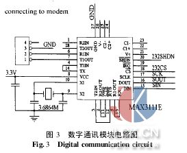 模拟电路模拟电路部分实现对心电信号的采集、放大、滤波以及A/D转换。其构成见图2。 如前置放大电路主要由仪表放大器AD620构成。AD620具有低功耗、低噪声、低温漂的特点,最大偏置电流2nA,共模抑制比达到93dB以上。AD620与外接电阻配合将心电信号放大100倍。我们利用右腿驱动电路来去除人体的交流干扰。这种做法不会损失心电信号的频率成分。由于不同患者的心电信号强弱不同,因而仪器需要自动对放大倍数进行调整,实现方法为调整下一级放大电路中反馈电阻的阻值。具体做法是用一片4路输出选择器74HC4052来控制反馈回路的选通。自学习程序将判断初始心电放大倍数的大小,然后由DSP芯片修改选择器的控制位来得到合适的放大倍数。整个放大电路的放大倍数范围为2001 500倍。电压上拉电路将使基线电压由0V变为1V,以满足A/D转换芯片的转换范围。双T型50Hz陷波电路用来去除50Hz工频信号的干扰。A/D转换芯片选用MAX1242为逐次逼近式A/D芯片,转换位数为10位,采用SPI串行总线控制,电压转换范围为02.5V。经计算,模拟电路的总共模抑制比≥80dB。 DSP芯片及存储电路TMS320VC5402是一款性价比很高的定点数字信号处理器,其最高处理速度可达100MIPS,C5402有8条总线,使得执行程序可以高度并行。它的数据/程序寻址空间达到1M×16bit,并且内置4k×16bit ROM和16k×16bit RAM。C5402有2个多通道缓冲串行口、一个8位主机接口(HPI)、2个16位定时器以及6通道DMA控制器。 我们采用闪速存储器SST39VF040来存储数据。这款Flash采用并行总线,可以存储4Mb数据,写入一个字节的速度为14μs,读取一个字节的速度为70ns,可反复擦写次,可以完全满足低采样率A/D转换数据的实时存储要求。除了存储心电信号,Flash还需要存储DSP芯片的内嵌程序。整个程序在DSP的RAM中运行,但在掉电后不能被保存,因而需要将程序保存在FLASH中。系统上电后,C5402首先运行固化在ROM中的Bootloader代码,自动把存储在闪存中的程序写入DSP的RAM,写入结束后主程序开始运行。 SST39VF040以字节为单位进行数据存储,共有19条地址线,其中的低16位直接与C5402的地址总线相连,而最高3位则连接C5402的异步串行口,这样通过控制异步串行口的输出,就可以改变对FLASH的高位寻址。例如,我们首先将连接高3位地址线的串行口输出设为“000”,然后执行寻址“010h”的指令,则最后所寻地址为0h+010h=010h;如果把连接高3位地址线的串行口输出改为“001”,然后仍执行寻址“010h”的指令,则所寻地址变为10000h+010h=10010h。可见,通过改变高3位地址,我们可以分别访问FLASH的8块起始地址不同的扇区。每块扇区的大小为64kb。其中起始地址为0h的第一块扇区被用来存储内嵌程序,其余7块用来存储心电数据。时钟芯片如果能记录下每段心电数据的采集时间,就可以方便地对心电数据进行统计分析,这十分有利于对患者的长期观察。我们用Dallas公司生产的DS1302涓滴电流式时钟芯片实现这一功能。 DS1302相当于一块电子表,存储包括年月日在内的准确时间信息。此芯片采用双电源供电方式。当系统上电后,它由3.3V系统主电源供电;当仪器关闭后,我们用一块3V钮扣电池供电,以保持芯片继续计时。当开始采集一段心电数据时,我们首先从DS1302中读出时间信息,存储于这段心电数据的开头。当用Modem传送某段心电信息时,它的时间信息首先被医院中心站接收读出。 另外,在待机状态时,监护仪通过液晶显示从时钟芯片读出的时间。 液晶显示模块我们选用精电蓬远公司的MOBI2002图形点阵式液晶,其分辨率为96×48。MOBI2002的驱动芯片为Philips公司的PCF8548。驱动芯片内有96×6字节的DDRAM,每个字节控制一列共8个象素点的状态。由于这款液晶没有自带的字库,因此所有数字与字母的字库都需要我们自行设置。 这款液晶的特点是采用总线I2C控制。总线是Philips推出的一种二线制串行总线。两条通讯线分别为串行数据线SDA和串行时钟线SCL,使用时必须为每条通讯线加一个上拉电阻以保证当总线空闲时为高电平。这两条线由C5402的HPI口模拟为通用I/O口进行控制。使用I2C总线在保证传输速度的同时,有效节省了系统资源。数字通讯模块本监护仪可以利用电话网络,通过Modem拨号将储存的心电数据传送给医院的中心站。通常Modem由RS232串行口进行控制,而C5402只能输出和接收TTL电平的信号。因此为了在C5402和Modem之间实现双向的电平和时序转换,我们选择MAX3111E来完成此项功能。MAX3111E集成了一个通用异步收发器(UART)和一个有15kV静电保护的RS232收发器。MAX3111E采用SPI串行接口,其内部的电荷泵使它通过3V电源就可以产生符合RS232电平标准的信号。UART包括晶体振荡器和可以软件设置的波特率发生器。我们将波特率设置为9600。我们要同时使用MAX3111E的UART和MAX232收发器,因此将UART的输出管脚与RS232收发器的输入管脚相连,将UART的输入管脚与RS232收发器的输出管脚相连(图3)。
