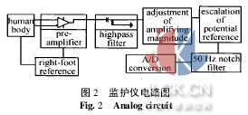 由于心脏病发病时一般具有突发性、短暂性和危险性的特点,因此有必要对患者的心电图等生理参数进行长时间实时检测,实现及时抢救和疾病预报。当前我国医疗资源仍然十分紧张,而远程医疗、社区护理是解决这一问题的有效办法[1,2]。可供社区、家庭使用的便携式心电监护仪,有着广泛的应用前景。 基于普通16位单片机的便携式心电监护仪,能够实现心电信号的存储、显示、传输及简单的判病报警[3],但由于所采用的单片机运算速度有限,难以采用耗费资源多的算法,如近年发展迅速的小波分析。有人制作以DSP芯片为核心的心电数据分析卡,插在PC机内,内嵌小波算法处理心电信号[4]。这种方法在心电分析上取得显著效果,缺点是必须配备PC机。目前,虽有使用其他系列DSP芯片的心电监护模块[5],但还没有见到使用较先进的C5000系列芯片的便携心电监护仪。随着技术的发展,DSP芯片的性能有很大提高,这使我们能够进一步扩展便携仪器的功能。 本监护仪的设计目标是患者可以带着它自由走动,能够自我监护,实现真正的便携与易用;具有较强的数据处理能力,保证心电检测的高准确率;能够便捷地与医院中心站进行通讯。这样的监护仪,将成为家庭、社区护理的有力帮手。 硬件电路的设计 监护仪主要构成如图1所示。DSP芯片TMS320VC5402通过丰富的接口控制周边器件。模拟电路通过导联线与人体相连,负责采集、放大肢体Ⅱ导联的心电信号。大容量的Flash存储器能够长时间存储心电信号,从而使监护仪具有类似Holter的功能。时钟芯片为监护仪提供准确时间信息,可用来标记每段心电信号的采集时间。液晶显示模块可以实时显示心电波形和监护信息。本监护仪采用数字通讯和模拟通讯2种通讯模块。数字通讯模块可通过Modem向医院传送完整的心电数据,而模拟通讯模块把心电信号耦合成声音信号,只要有电话的地方就可以向医院传输,十分灵活。系统采用锂离子电池供电,可以随时充电,连续使用。
