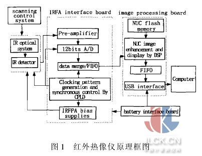 1引言 长线列红外焦平面探测器是高分辨率航空、航天遥感成像的关键元部件。为了研究长线列探测器用于系统设计时所需要解决的关键技术,我们研制了一台基于长线列MCT1024成像仪器。 通常热像仪采用的是ISA总线或PCI总线插卡[1],这种插卡方式由于其拆装不方便,甚至会造成硬件损坏,这就不得不使我们在设计成像仪时考虑使用插拔方式更为灵活的接口方式来实现数据采集的处理与计算机的实时通讯。对于本成像仪器,如果采用12位数字信号,每秒12Mbit因而USB1.0不能达到要求,故可选用USB2.0作为数据传输接口。本文介绍了一个完整的系统设计与实现,为MCT1024构建了一个实现平台,其设计思想对其它的高速数据采集系统有一定的借鉴意义。 2系统组成和工作原理 系统原理框图如图1。由光学系统所成的像通过MCT1024探测器转换成电信号。由于MCT1024探测器各阵元的信号分别通过奇列输出端和偶列输出端移位输出,所以四路信号分别对应前放单元。图中只画出一路。经过整合后的数据送入缓存FIFO。FIFO中的数据由USB接口单元送出,通过该单元的处理,所采集到的数据发送到计算机进一步处理,显示,存储等。