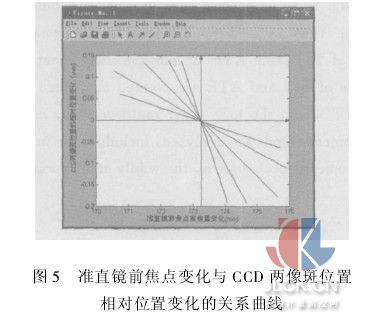 在焦点附近放置点光源,移动照亮的±2°视场大小的物体,观察spot diagram质心的变化量作为CCD输出信号之间相位差获得像的相对偏移量,输入MATLAB,如图5所示,由于利用理想透镜参数进行仿真,所以光路近为近轴光学,结果近似为一条直线,但是实际情况由于像差和制造误差的影响实际情况会有所不同。不同的双分离透镜参数对应不同的关系曲线,从而可以根据需求和实际制造要求,选择合适双分离透镜参数满足不同的调焦精度要求,图中所示曲线1代表F数为8,焦距为140mm的双分离透镜,随着焦距的增大,曲线靠近Y轴,反之,则远离。