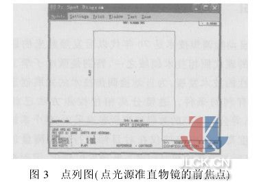 通过准直镜头的光束经平面反射镜反射后进入自动检焦系统。为方便起见,不考虑平面反射镜。通过准直镜头的光束经双分离透镜后被分成两个部分,在CCD传感器上成像。光束成像后对比度最高的地方称为像的脉冲,或称相位,像的脉冲间距叫做相位差。当调焦准确时,经过分离镜片生成的两束光线投影在CCD上的距离是一定的,作为焦点检测的基准。用AB来表示作为CCD上两光斑的位置的基准。当调焦不准时,有两种可能性。一种是准直镜前焦点在目标像面之前。此时受光的CCD上两光斑的位置之间的距离短于AB;另一种情况是准直镜前焦点在目标像面之后,此时受光的CCD上两光斑的位置之间的距离长于AB,根据受光的CCD上光斑的位置之间的距离,就能鉴别出焦点是否准确。只要测出这个偏移量,就能检测出焦点的偏离状态。根据CCD上两光斑的位置的距离与AB的差值,即检测相位差的变化量,经过转换电路和模拟/数字转换电路,再送入系统的CPU中央处理单元,CPU按照设定的程序,可计算出准直镜前焦点离开第一像面的距离,以及散焦[2]方向。准直镜的移动量就是根据这种相位差的变化量来确定相应的电压信号,按一定的函数关系,由一套系统自动控制的。 3光学系统ZEMAX模拟分析及结果[3] 经纬仪的自动调焦精度指当输入准直镜前焦点离开目标像面的距离信号时,伺服系统调整后,反映在第二像面上就是离焦量,这样调焦精度取决于第一像面的焦深,Δd可按下公式计算Δd=±4λf20/D20(λ为光波波长;f0为第一像面的焦距;D0为入瞳孔径)Δd一般在0.14左右,调焦精度取其1/5左右,0.0220.03mm。通过简单的计算,选择合适的镜头数据,可以满足整个检焦系统的景深[4]在望远物镜的一半焦深范围之内的精度要求。 利用ZEMAX进行系统的性能仿真,下面是—经纬仪准直物镜和双分离透镜部分仿真(如图2,图中省略望远物镜采用理想镜头进行设计),取镜头参数满足自动调焦精度条件,假设点光源在准直物镜的前焦点上,经理想镜头后,CCD传感器上的spot diagram,移动点光源在望远系统的前后焦深范围边缘,CCD传感器上的spot diagram为一个像素,如图3、图4仿真证明满足精度要求。