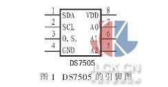 1概述 DS7505[1]是 Maxim 公司的数字温度计及温控器,其工作电压为 1.7~3.7 V,测量温度范围为-55℃~+125℃,当所测温度超过 0℃~+70℃时,其精度可达±0.5℃。 用该器件测量温度时无需任何外部元件。 该器件读取分辨率有 9 位、10 位、11位、12 位四档,通过两条串行接口线 SDA 和 SCL 进行数据的读写操作。 DS7505 是以高位对齐低位补零的方式存储数据,由于 DS7505 是从高位读取数据,因此在只读取整数温度时,只需读取一个字节。图 1 给出 DS7505 的引脚排列,其中 SDA为数据的输入输出;SCL 为时钟输入;O.S. 为控制输出;GND为接地;A0,A1 与 A2 为地址输入;VDD 为输入电压。
