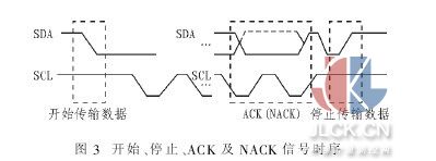 配置寄存器的 F0 与 F1 位用于设置温控器的容错能力,即规定所测温度连续超过 Tos 或 Thyst 寄存器内数值的次数,即激活 O.S.的条件,F1F0=00 时激活 O.S.所需连续次数为1;F1F0=01 时 , 所需次数为 2;F1F0=10 时 , 所需次数为 4;F1F0=11,所需次数为 6。 2.3寄存器指针 寄存器指针是一个 8 位寄存器, 其中高 6 位置零, 低 2位(P1 和 P0)用来设置访问寄存器,如表 5 所示。 对 DS7505读写操作时必须先通过 P1 和 P0 设定要访问的寄存器。 一旦设定后不能对其更改。 从温度寄存器读取数据时,只需设定一次寄存器指针,只要不改变,数据将顺序从寄存器读出。 但是当寄存器写入时, 每写入一次 (即便是向同一寄存器写入),寄存器指针都需要重新设定。 上电时指针默认指向温度寄存器,因此读数温度寄存器无需重新设定指针。 2.4 Tos与Thyst寄存器 Tos 和 Thyst 寄存器的数据格式与温度寄存器相同。 每次温度转换后,转换值都与储存在这两个寄存器中的数值进行比较。O.S.的输出是根据 DS7505 的操作模式和比较器的结果进行更新。 在温控器比较期间所使用的 Tos 和 Thyst 中的数值的位数与温度数据读取分辨率相同,如分辨率为 9,则温控比较器只使用 Tos 和 Thyst 的高 9 位。 如未用 DS7505 的控温能力,O.S.位的输出就与 Tos 和 Thyst 无关,此时这两个寄存器可用做一般存储器存储数据。 3 2线串行数据总线 DS7505 通过串行时钟信号 (SCL) 及串 行数据信 号(SDA)两条 2 线串行数据总线进行通信。 总线上,主机 (如单片机)产生 SCL 信号并发送启动和停止命令。 当 SDA 和 SCL都为高电平,总线处于空闲状态。 当 SCL 保持为高且 SDA 产生一个由高到低的电平时,主机开始传输数据;当 SCL 保持为高而 SDA 由低变为高时,主机停止数据传送,总线回到空闲状态。 所有通信都是从 MSB 位开始。 接收设备(主或从机)每接收一个字节,都将在 SDA 上产生一个低电平的确认信号ACK,当主机接收完最后一个数据字节时 ,将发送高电平的非确认信号 NACK 来暗示接收数据已结束。 如图 3 所示。