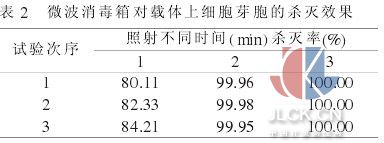 5.2 杀菌效果 微波消毒箱在 720W功率条件下, 将菌片放入 200mL微波增效液内, 照射 3min, 对枯草杆菌黑色变种(ATCC9372)芽胞可杀灭 99.9%以上, 照射 4min, 对枯草杆菌黑色变种(ATCC9372)芽胞平均杀菌率可达到 100%。见表 2。