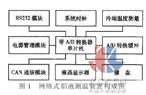 该网络式铝液测温装置主要技术参数为: 配合 K 型热电偶, 温度测量范围 0~1300℃, 测量精度取决于热电偶精度; 冷端温度测量范围- 28~+140℃, 精度 0.5℃; 电源为24V DC,200mA。 RS232 和 CAN 总线口为一个接口, 靠针号不同实现多用途。可用配套提供的接口线连接。 网络式铝液测温装置可以测量和存储多台混合炉的温度,并具有掉电存储功能; 通过 CAN 总线网络向混合炉和监控机传送测量温度功能; 可选通过 RS232 口向监控机传送测量数据。 三、主要技术特点 1.有效利用了现场CAN 总线网络方式传送温度信号, 将测温装置纳入现场工控网络系统。 2.专为铝电解铸造设计的, 能根据所测不同区域输入炉号和通信号等技术参数。 3.采用最新 24 位∑- △型 A/D 转换器, 提高了测量精度, 并具有良好的抗干扰性。 4. 软件部分能够配合监控程序直接形成工艺参数报表、实时温度曲线、历史温度曲线、图形温度报表、系列温度报表。 四、应用效果 2005 年 8 月, 中国铝业青海分公司第三电解厂铸造车间混合炉使用网络式铝液测温装置和现行铠装热电偶对混合炉炉温进行了监控调整, 实际情况表明, 根据不同设定值能较好地实现自动控制调节功能, 准确控制混合炉温度, 为铝锭生产工作的顺利进行提供了有力保证, 并且有很好的节能效果。 摘自:中国计量测控网