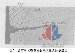 图2中裂纹深0.12 mm,比人工标准伤0.05 mm深一倍多,但裂纹反射波低于人工标准伤反射波,所以未报警,造成漏检。分析说明,钢基体与金属氧化物声阻抗值相差较小,声压反射率RB经计算约为42%。钢与铝声压反射率RB为45%,所以金属氧化物声学特性与铝声学特性相似。同样大小的缺陷,由于耦合界面两种物质声阻抗的差值不同,会呈现不同的灵敏度。钢基体与金属氧化物声压反射率RB为42%,明显低于钢与机油界面的声压反射率RB(94%),一部分声波透过金属氧化物继续向前传播,所以,含有金属氧化物的裂纹比无填充物的裂纹较难检出,见图3所示。