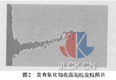 但21-4N冷拉棒材在生产过程中产生的表面裂纹,虽然经过表面磨制,仍有少量表面裂纹未处理掉,裂纹内充满氧化物夹杂,见图2。夹杂性质见电镜扫描数据(表1)。