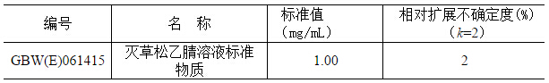 GBW(E)061415 灭草松乙腈溶液标准物质 主要用于环境、食品等领域相应农药成分残留检测,农药生产部门和检测实验室质量控制、分析仪器检定/校准、分析方法确认评价等。