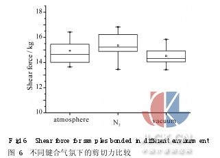 由图中可以看出,烧结温度越高,键合后的剪切力越大。烧结温度为400℃和450℃时,剪切力较低,仅为10kg,这是因为峰值温度太低,没有达到玻璃浆料的熔融温度,浆料中的颗粒未完全熔融,不均匀的分布在键合层,导致键合强度的降低。扫描电镜下观察到的图像如图4所示,玻璃浆料分布不连续,均匀性较差,这是影响键合强度的主要因素。图5为500℃烧结后键合层形貌的扫描电镜图。与400℃的图像相比较,玻璃浆料中的颗粒充分熔融,仅有较小的颗粒和气孔。经测量,在烧结温度为500℃时,剪切力平均值为15·2kg,与400℃和450℃的烧结温度下的剪切力相比有了较大提高。由此说明, 500℃以上的烧结温度可达到较高的键合强度。然而,基于器件上金属布线的限制,烧结温度不能高于550℃(Al-Si共熔点577℃)。 3·3键合气氛对键合强度的影响 图6为不同键合气氛下的剪切力测量值(预烧结温度400℃,烧结温度500℃)。从图中可以看出,在空气、氮气和真空中的剪切力大小基本一致,因此可以认为,键合气氛对键合强度的影响可以忽略不计。 3·4压力对键合强度的影响 在烧结过程中需加以一定压力,以保证键合强度及气密性要求。图7为不同压力下的剪切力测量值(预烧结温度400℃,烧结温度500℃,氮气气氛)。当外加压力为0时,剪切力为8kg。当外加压强为3kPa时,剪切力提高到了15kg,而再继续增加到6kPa、12kPa时,剪切强度值没有明显变化。这是因为预烧结后浆料表面凹凸不平,即使浆料中的颗粒完全熔融,在没有施加外压的情况下,表面张力的存在使得键合面未能完全接触,键合层中含有气泡和孔洞,影响了键合强度。所需的外压只需克服浆料熔融时的表面张力,使键合面完全接触,排出不平整处残留的气体。因此,施加外压后键合强度显著提高。