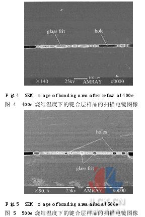 压力大小直接影响到键合后的外观质量。玻璃浆料在熔融键合过程中会向外延展,线条变宽。并且外压越大,延展越多。因此所加外压不宜过大,只需克服玻璃浆料熔融时的表面张力即可。 3·5气密性检测 依据相关标准[8],样品在压强为0·4MPa的氦气中保压2h后进行漏率测量,其漏率极限值为4×10-7。实验测得的漏率值均为10-8量级,符合要求。精检合格的全部样品进入下一步的氟油粗检。在氟油粗检中有15%的样品观察到了气泡的产生,判定为失效。同样的烧结条件下,封装的气密性与浆料印刷的质量相关。欲提高圆片级封装的合格率,必须保证玻璃浆料印刷的平整度与均匀性。 4结论 低温烧结玻璃浆料对MEMS器件进行气密封装是一个可行的方法。采用预烧结温度400℃(空气气氛),烧结温度500℃(空气、氮气或真空),外加压强3kPa以上时,键合后的剪切力达到相关标准(如MIL-STD-833E)的要求,漏率检测合格率达到85%。该方法工艺简单,可靠性高,成本低,可实现芯片的圆片级封装。 摘自:中国计量测控网