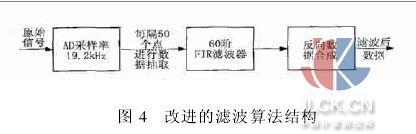 由于传统的3000阶数字滤波器运算量很大,在实际的应用中很难实现。通过对现有比较成熟的数字滤波器的分析和计算机仿真,设计了改进的有限冲击响应带通滤波器(FIR)来实现实时滤波处理。带通滤波器结构如图4所示。