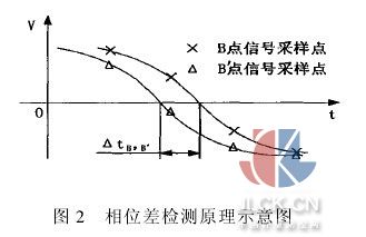ω为系统的主振动角频率(rad/s);K为与测量管的形状、尺寸、材料和激励信号等有关的系数(kg/s2);φBB′为B,B’的相位差(rad)。 因此相位差检测在CMF中至关重要,直接决定着系统的测量精度。传统相位差检测多为模拟检测原理,即利用模拟比较器进行过零点检测,从而实现相位差检测。实际上,使用现场存在各种震动及电磁干扰,造成检测电路的输入信号中存在各种噪声。这些噪声分量会改变正弦波的过零点位置,从而影响相位差检测精度,因此必须采用模拟滤波器滤除噪声。但是模拟滤波器阶数有限,难以消除与有用信号频率接近的噪声,而且存在两路滤波器特性不一致及元件参数漂移等问题,造成检测误差。 数字信号处理方法可以有效避免元件参数漂移等问题,而且使更有效的噪声抑制方法成为可能。目前基于数字信号处理技术的相位差检测方法主要有两种:一种是利用FFT在频域计算,一种是互相关求相位差。由于这两种算法要求整周期采样,而测量系统的信号周期不是固定的,因此需要一套较为复杂的测量电路来保证采样周期和信号周期的整数倍关系,而且运算方法较复杂[3,5]。因此,作者提出采用数字式过零点的相位差检测新原理,即利用DSP对信号的波形进行时域分析,计算出过零点的时间差,进而得出信号相位差。