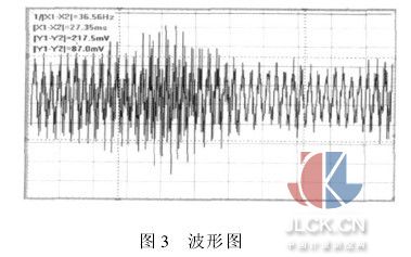 从表1中可以看出,由涡街信号幅值进行补偿气体密度得到的质量流量和理论值基本一致,但有些点的误差比较大,是什么原因造成的?为此我们对测试过程作如下分析:由涡街信号进行频谱分析测量到的涡街频率是准确的,误差很小;而测量涡街信号的幅值时,由于脉动流的存在,幅值大小在变化,这时幅值的测量误差就很大,如图3所示,这是示波器显示的压电晶体信号,这时读出的数据误差就比较大。 从图1中右边的频谱图可以看到除了涡街信号的谱线外,还有高频的干扰谱线,经分析发现是介质高流速时波动的原因之一。