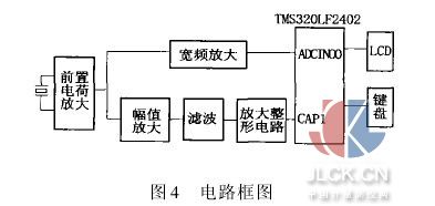 3信号处理电路 压电晶体将涡街信号转换成电荷(也可以等效为电压)信号,先经过一级电荷放大电路将电荷信号变为电压信号,如图4所示。电荷放大电路输出分两路,一路将信号定值放大,其输出送到DSP的A/D输入端,DSP对此信号进行FFT变换;另一路进行含自动增益控制的放大电路,将交变的涡街信号放大,再经过滤波电路滤去高频的干扰信号,最后得到涡街信号的方波信号,由CPU测出其频率f。由涡街的频率值将FFT变换的结果对应的频谱幅值算出,此值和涡街作用力线性关系,通过程序按照(4)式计算出流体的质量流量,并进行累加、输出和显示等。