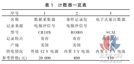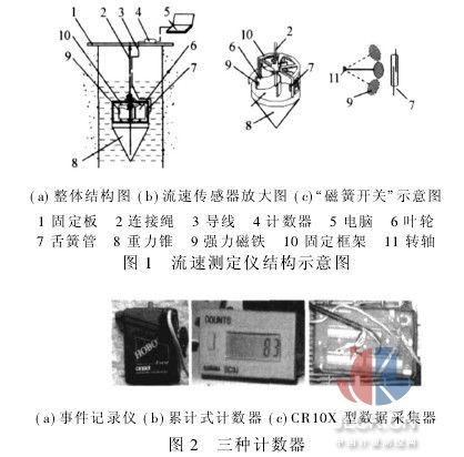 3测定仪的工作原理 利用叶轮的转动速度与水流流速成正比的关系,流体流动推动叶轮旋转,当安装有强力磁铁的叶片从舌簧管旁边经过时,舌簧管内部的一对弹性舌簧片在磁场吸引力的作用下,克服舌簧本身的弹性阻力而接触导通,并随着带有强力磁铁的叶片的远离而断开,在这一过程中“磁簧开关”将产生一个电脉冲信号,该电脉冲信号将通过导线被传输到计数器中,计数器将随时传来的电脉冲信号以不同的形式记录下来,其中电子式累积计数器将累加的数字显示在液晶屏幕上。 这种计数器需要借助时钟来计算水流的流速;事件记录仪将产生每个电脉冲信号的时间记录下来,并寄存在单片机上,隔一段时间用电脑通过专用软件(如Boxcar Pro 3·51)将储存在事件记录仪中的数据取出即可;数据采集器是根据事先设定好的采样间隔,将一定时间内所产生的电脉冲信号总数记录下来,并寄存在单片机上,隔一段时间用电脑通过专用软件(如PC208W)将储存在数据采集器中的数据取出即可。