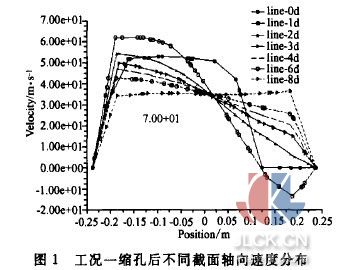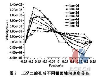 图1为工况一挡板后区域不同截面轴向速度分布。横坐标为中心截面上X方向的位置,纵坐标为轴向(Z方向)速度分布。图中7条曲线分别表示档板处、档板后1倍管径处、2倍、3倍、4倍、6倍及8倍管径处的轴向速度分布.通过比较分析可以看出左右偏差随着远离档板而削弱的过程,在8倍管径处(即弯头人口截面)这种不均匀性已经消失。还可看出在1倍管径处存在明显的回流区,而且回流速度最大达到12m/s. 图2为工况二时的情况。此时,由于缩孔开口减小,缩孔挡板后的左右不均匀性更大,回流区长度更长,在3倍管径处仍然存在负速度。