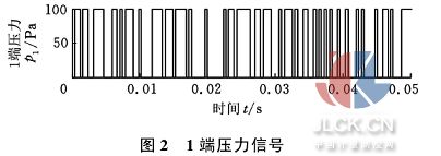 其中,T为M序列的时间周期,根据不同的频率分析精度设定。如设定分析精度为10Hz,则M序列周期T =0·1s。 假设要分析的衰减器的频宽为2000Hz,则计算所用的移位寄存器个数n =8,反馈权重系数[6] {Ci} = {1,1,0,0,0,0,1,1} (8) 移位寄存器初始值全置为1。所得到的p1端前半周期的压力信号如图2所示。出口端(即图1中2端)及其他边界均设置为刚性壁面。