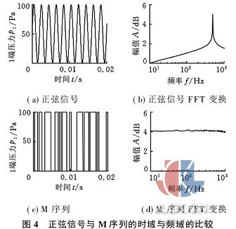4分析与讨论 4.1计算方法的特点比较 如图4所示,正弦信号对应一个频率,在一次模拟中可以使用一个或多个频率叠加起来共同作用,要得到一定范围的频率响应,需要数次模拟才行;M序列则对应一定范围内的频率,可以在一个周期内一次性地模拟衰减器的频率响应。