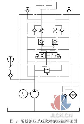 根据这样的工作特点,我们可在双联泵的压力油出口处设置卸荷阀和蓄能器。由卸荷阀的自身性能我们知道,当出口压力达到其设定值时,就会使由P到T的油路导通,低压卸荷。夹轮器夹紧时,电液换向阀带电,双联泵与蓄能器一起向液压缸供油,当液压缸带动执行机构夹紧车轮时, A口压力升高使大泵出口处卸荷阀的单向阀锁闭,此时大泵低压卸荷,只有小泵单独供油(小泵出口处卸荷阀的设定值要高于大泵),至压力继电器设定压力时,继电器发讯,电磁球阀和电液换向阀同时断电,实现夹轮保压功能。 这样不仅降低了功率损耗,减少了系统的发热,还将有效延长泵和电机的使用寿命。 2·1·2应用换向阀的卸荷回路 如图2,场桥液压系统微移液压缸原理图。 该液压控制回路选用的是H型机能的三位换向阀,当该液压缸执行微移动作时,电磁换向阀带电,压力油进入液压缸有杆腔或无杆腔,动作到位后,检测信号将控制电磁换向阀断电,液控单向阀保压,同时泵就可以通过换向阀的中位卸荷。 采用具有中位卸荷机能的三位换向阀使液压泵卸荷的这种方法简单、可靠,除H型机能外, M、K型机能也可以达到中位卸荷功能,这种方法适用于低压、小流量的液压系统;应用于高压、大流量系统时,为使泵在卸荷时仍能提供一定的控制油压(2~3bar),可在泵的出口处(或回油路上)增设一单向阀(或背压阀),但这将同时使泵的卸荷压力增加。 另外,还可以采用二位二通阀的卸荷回路,这种卸荷回路,二位二通阀的规格必须与泵的额定流量相适应,因此这种卸荷方式不适用于大流量的场合,且换向时会产生液压冲击,通常用于泵的额定流量小于63L/min的液压系统。
