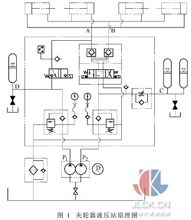 2·2·2应用容积调速回路和联合调速回路 利用改变变量泵或变量液压马达的排量来调节执行元件运动速度的回路,称为容积调速回路。这种调速回路无溢流损失和节流损失,故效率高、发热少,适用于高压大流量、大功率设备的液压系统。 联合调速回路无溢流损失,其效率比节流调速回路高。在采用联合调速方式中,应区别不同情况而选用不同方案:对于进给速度要求随负载的增加而减少的工况,宜采用限压式变量泵节流调速回路;对于在负载变化的情况下进给速度要求恒定的工况,宜采用稳流式变量泵节流调速回路;对于在负载变化的情况下,供油压力要求恒定的工况,宜采用恒压变量泵节流调速回路。 2·3蓄能器的合理应用 2·3·1应用蓄能器作辅助动力源 如图4为我公司为秦皇岛设计的夹轮器液压系统原理图。 工作开始时,恒压变量泵启动,当压力达到顺序阀的设定值,顺序阀打开给蓄能器充油,当充油压力达到泵的调定值时,泵处于恒压卸荷状态,蓄能器充油完成。 夹紧动作执行时,蓄能器通过单向阀2与泵一起向液压缸供油,满足液压缸快速夹紧的动作要求,夹紧到位,单向阀1封住保压,压力继电器发出联锁信号,可以执行本工作周期的下一步动作。 这种控制思路可应用于总的工作时间较短的间歇工作系统或在一个工作循环内速度差别很大的系统。使用蓄能器作辅助动力源可降低泵的功率,提高效率,降低温升,节省能源,故系统设计时,只需按平均流量选用泵,从而使泵的选用和功率利用更合理。