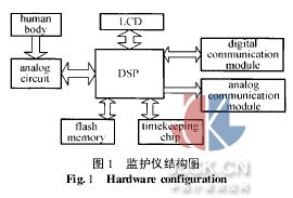 由于心脏病发病时一般具有突发性、短暂性和危险性的特点,因此有必要对患者的心电图等生理参数进行长时间实时检测,实现及时抢救和疾病预报。当前我国医疗资源仍然十分紧张,而远程医疗、社区护理是解决这一问题的有效办法[1,2]。可供社区、家庭使用的便携式心电监护仪,有着广泛的应用前景。 基于普通16位单片机的便携式心电监护仪,能够实现心电信号的存储、显示、传输及简单的判病报警[3],但由于所采用的单片机运算速度有限,难以采用耗费资源多的算法,如近年发展迅速的小波分析。有人制作以DSP芯片为核心的心电数据分析卡,插在PC机内,内嵌小波算法处理心电信号[4]。这种方法在心电分析上取得显著效果,缺点是必须配备PC机。目前,虽有使用其他系列DSP芯片的心电监护模块[5],但还没有见到使用较先进的C5000系列芯片的便携心电监护仪。随着技术的发展,DSP芯片的性能有很大提高,这使我们能够进一步扩展便携仪器的功能。 本监护仪的设计目标是患者可以带着它自由走动,能够自我监护,实现真正的便携与易用;具有较强的数据处理能力,保证心电检测的高准确率;能够便捷地与医院中心站进行通讯。这样的监护仪,将成为家庭、社区护理的有力帮手。 硬件电路的设计 监护仪主要构成如图1所示。DSP芯片TMS320VC5402通过丰富的接口控制周边器件。模拟电路通过导联线与人体相连,负责采集、放大肢体Ⅱ导联的心电信号。大容量的Flash存储器能够长时间存储心电信号,从而使监护仪具有类似Holter的功能。时钟芯片为监护仪提供准确时间信息,可用来标记每段心电信号的采集时间。液晶显示模块可以实时显示心电波形和监护信息。本监护仪采用数字通讯和模拟通讯2种通讯模块。数字通讯模块可通过Modem向医院传送完整的心电数据,而模拟通讯模块把心电信号耦合成声音信号,只要有电话的地方就可以向医院传输,十分灵活。系统采用锂离子电池供电,可以随时充电,连续使用。