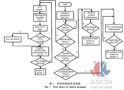 4个外部中断分别对应监护仪的4个控制按钮。程序实现对中断的嵌套调用,使按键在不同工作状态下也代表不同的功能选择,就像手机按键一样。心律失常的判别算法[6]嵌在系统程序中。在硬件中,没有对心电信号进行低通滤波。 我们设计一种40阶FIR低通滤波器,对心电数据进行软件滤波。这样既节约了硬件资源,又提高了滤波效果。 结果与讨论 我们用监护仪实际采集人体的心电信号,检测心电放大电路的效果。对于算法,通过软件来检测它对MIT心电数据库的检测准确率。我们还将实验室的一台机器装上医院中心站软件,连接上Modem和模拟接收机,用监护仪与其进行数字通讯和模拟通讯试验。在把监护仪充满电后,测试了其使用时间。 各项测试结果如下: 1)经过放大和滤波处理的心电信号稳定度高,因测试者活动产生的基线漂移大大减少;高频干扰被滤得很干净。 2)监护仪操纵界面友好,液晶显示清晰快捷,能够描画出实时心电波形,实现了对心电信号的实时采集与分析。用MIT心电数据库进行检验,算法对R波的检出率达99%以上[6]。对停搏、漏搏、心动过速、过缓能及时做出报警。 3)数字通讯中,Modem拨号成功,心电信号被成功传播到中心站电脑上并显示出图形。 4)模拟通讯中,转化为音频的心电信号用普通电话传给作为医院中心站的电脑,并被成功还原为心电波形。这种方法传输的心电信号在被还原之后明显比原始信号平滑,因为多次转换造成了细节上的损失,但仍保存着概貌的信息。 5)由于采用大量贴片元件,设计合理,整个系统十分省电。锂电池充满一次电后可待机5h以上(当不使用模拟传输时达到此项指标,模拟传输模块中的蜂鸣器耗电量大,频繁使用会缩短待机时间)。 本监护仪在设计上主要针对家庭用户,目前实现了4种常见的心律失常报警。下一步可以根据使用中的实际需要来调整其功能。考虑在今后的改进中采用具有更大内部RAM的C5000系列DSP芯片,以使软件能够进一步扩展。拟加入对心电数据的压缩算法,这样闪存所能存储的心电数据长度可超过目前的水平。也可以换用更大容量的闪存。 摘自:中国计量测控网