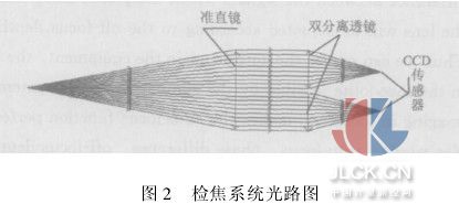 1引言 自动检调焦技术是70年代以后发展起来的最为活跃的现代照相技术领域之一,特别是微电子学工艺突破性的技术发展,为自动检调焦技术的发展创造了极为有利的条件。透镜分离相位检焦方法已经为canon等公司生产的数码相机所普遍采用,整个系统调焦精度高。光电经纬仪在对目标进行跟踪测量过程中,目标与设备的相对距离不断地发生变化,因而造成目标像面的离焦,影响了成像质量。现在诸多经纬仪是由雷达或激光测距机送来的距离信息电压来控制调焦机构自动调焦的。相位法自动检调焦技术根据检测像的偏移量实现自动调焦,其在经纬仪中的应用使被测目标自动清晰成像,使经纬仪的自动化功能更加完善。 2相位法自动检调焦技术在经纬仪中的应用 经纬仪自动调焦系统[1],系采用放置在望远光路中的准直镜进行自动调焦:当目标在无穷远位置时,准直镜做调焦元件是将其前焦点置于望远系统的第一焦面上,而当目标是在有限距离时,目标像面就离开第一焦面,只要将准直物镜沿轴线移动,使其前焦点离开第一焦面而落在目标像面上,此时目标光线经过准直物镜变成平行光,然后经过变倍物镜成像于第二像面,准直镜前焦点离开目标像面的距离,反映在第二像面上就是离焦量。由此可见,准直物镜移动只要前焦点落在目标像面上,后面为平行光对后面的光路无影响。
