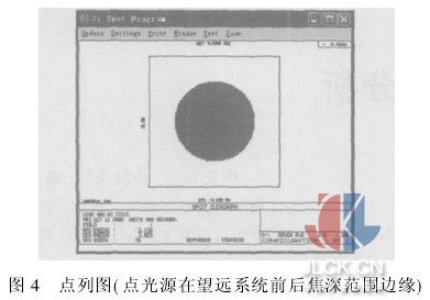 通过准直镜头的光束经平面反射镜反射后进入自动检焦系统。为方便起见,不考虑平面反射镜。通过准直镜头的光束经双分离透镜后被分成两个部分,在CCD传感器上成像。光束成像后对比度最高的地方称为像的脉冲,或称相位,像的脉冲间距叫做相位差。当调焦准确时,经过分离镜片生成的两束光线投影在CCD上的距离是一定的,作为焦点检测的基准。用AB来表示作为CCD上两光斑的位置的基准。当调焦不准时,有两种可能性。一种是准直镜前焦点在目标像面之前。此时受光的CCD上两光斑的位置之间的距离短于AB;另一种情况是准直镜前焦点在目标像面之后,此时受光的CCD上两光斑的位置之间的距离长于AB,根据受光的CCD上光斑的位置之间的距离,就能鉴别出焦点是否准确。只要测出这个偏移量,就能检测出焦点的偏离状态。根据CCD上两光斑的位置的距离与AB的差值,即检测相位差的变化量,经过转换电路和模拟/数字转换电路,再送入系统的CPU中央处理单元,CPU按照设定的程序,可计算出准直镜前焦点离开第一像面的距离,以及散焦[2]方向。准直镜的移动量就是根据这种相位差的变化量来确定相应的电压信号,按一定的函数关系,由一套系统自动控制的。 3光学系统ZEMAX模拟分析及结果[3] 经纬仪的自动调焦精度指当输入准直镜前焦点离开目标像面的距离信号时,伺服系统调整后,反映在第二像面上就是离焦量,这样调焦精度取决于第一像面的焦深,Δd可按下公式计算Δd=±4λf20/D20(λ为光波波长;f0为第一像面的焦距;D0为入瞳孔径)Δd一般在0.14左右,调焦精度取其1/5左右,0.0220.03mm。通过简单的计算,选择合适的镜头数据,可以满足整个检焦系统的景深[4]在望远物镜的一半焦深范围之内的精度要求。 利用ZEMAX进行系统的性能仿真,下面是—经纬仪准直物镜和双分离透镜部分仿真(如图2,图中省略望远物镜采用理想镜头进行设计),取镜头参数满足自动调焦精度条件,假设点光源在准直物镜的前焦点上,经理想镜头后,CCD传感器上的spot diagram,移动点光源在望远系统的前后焦深范围边缘,CCD传感器上的spot diagram为一个像素,如图3、图4仿真证明满足精度要求。
