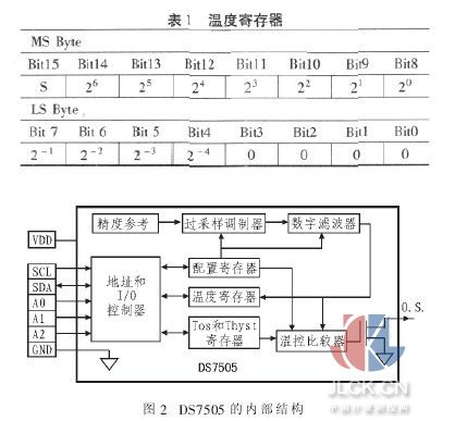 2 DS7505内部结构和功能 图 2 为 DS7505 内部结构。 包括地址及 I/O 接口控制器,精度参考,过采样调制器,数字滤波器,温控比较器以及 4 个寄存器,即配置寄存器,温度寄存器、Tos 与 Thyst 寄存器。 2.1温度寄存器 DS7505 把每次的温度测量值经 A/D 转换后存到该寄存器内。它是 2 个字节寄存器,温度值以二进制形式存储在该寄存器内如表 1 所示。 符号位(S)表示温度值的正负,S 为 0 代表正,S 为 1 代表负。 该位可随时读取,且并不影响该温度寄存器正在运行的操作。 该寄存器的 Bit0~Bit3 位被硬件置零。按照先从高位存储,低位补零的原则存储数据,如存储 12位温度数据时用 Bit15~Bit4 存储; 存储 11 位温度数据时,使用 Bit15~Bit5,并把 Bit4 置零;依次类推存储 10 位、9 位温度数据。 存储时选用哪种数据分辨率 (9 位、10 位、11 位或 12位)需对配置寄存器进行设置。