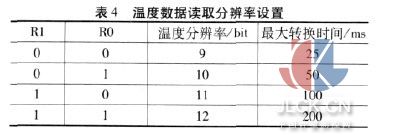 TM 位用来设置 DS7505 的工作模式 。 TM=0 则 DS7505处于比较器模式,当测得的温度值连续超过 Tos 寄存器中的温度值数次后 (超过次数取决于配置寄存器中的 F1 与 F0位),则激活 O.S.,并 O.S.一直保持有效,直到温度低于 Thyst寄存器内的数值为止。 当 DS7507 是由比较器模式进入睡眠模式,则不清除 O.S.输出。 TM=1 则 DS7505 处于中断模式,当所测值连续超过 Tos 寄存器内温度值数次后,O.S.激活。 一旦激活 O.S.只能使 DS7505 处于睡眠模式或者从任意寄存器读取数据才能使其失效,O.S.失效后其输出清零,当测量温度低于 Thyst 寄存器内的数值连续数次后,O.S.被重新激活[2]。存储温度数据前,应配置寄存器的 Bit6 和 Bit5(即 R1 与R0),用于选择温度数据存储分辨率。 如表 4 所示。